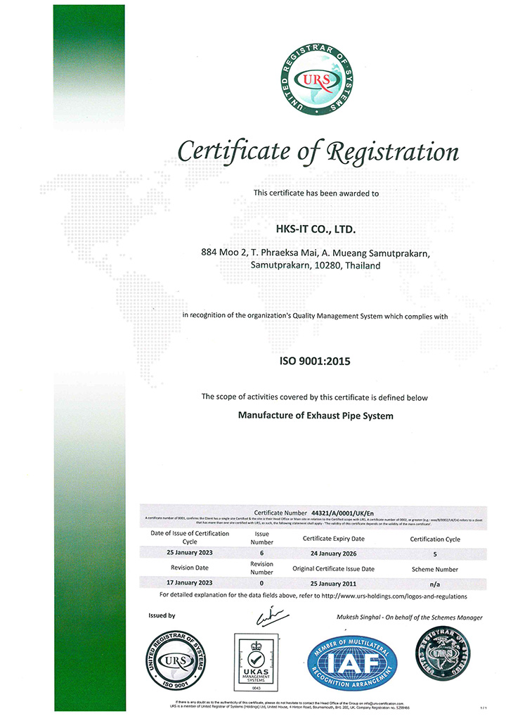 - Both of the research & development and production (Exhaust, Suspension, Turbo super charge and others) of HKS CO.,LTD has been certified in ISO 9001: 2008 continuously